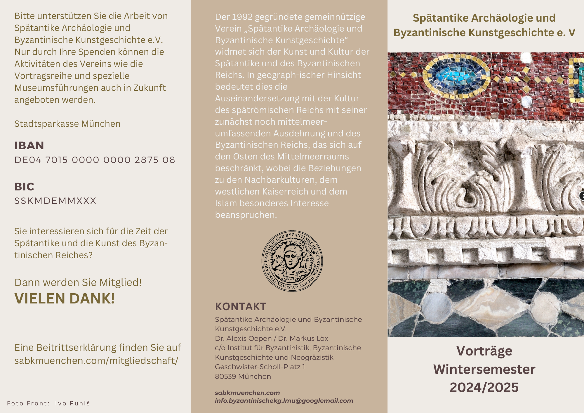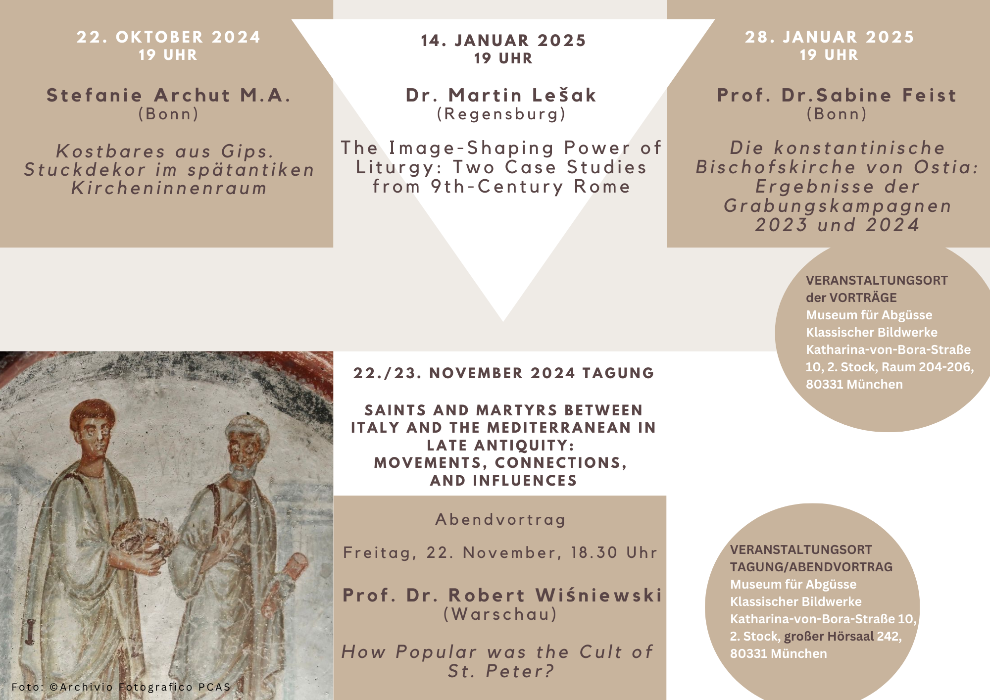 Unser Programm beginnt am 22.10. mit einem Vortrag von Stefanie Archut (Universität Bonn) zum Thema „Kostbares aus Gips. Stuckdekor im spätantiken Kircheninnenraum“. Frau Archut, Wissenschaftliche Mitarbeiterin an der Abteilung Christliche Archäologie und Koordinatorin des durch die Volkswagenstiftung geförderten Poolforschungsprojekts „Modulare Systeme in der Spätantike“, wird die Methodik und die Ergebnisse des Dissertationsvorhabens erläutern, das sie an der Universität Bonn zu plastischem Stuckdekor als Ausstattungselement von Innenräumen durchführt (https://www.iak.uni-bonn.de/christliche-archaeologie/de/forschung/promotionsprojekte/spaetantiker-und-frueh-byzantinischer-ausstattungsluxus).